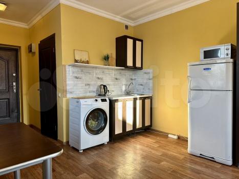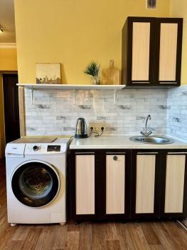 Кухня оснащена необходимой бытовой техникой, включая холодильник и микроволновую печь. Из кухни есть выход на балкон, где можно наслаждаться свежим воздухом. Совмещенный санузел оснащен современной сантехникой и стиральной машиной.