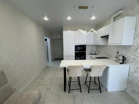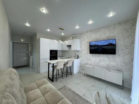 Просторная и светлая квартира с продуманной планировкой: уютная отдельная спальня с гардеробной и большая гостиная, объединенная с кухонной зоной.
