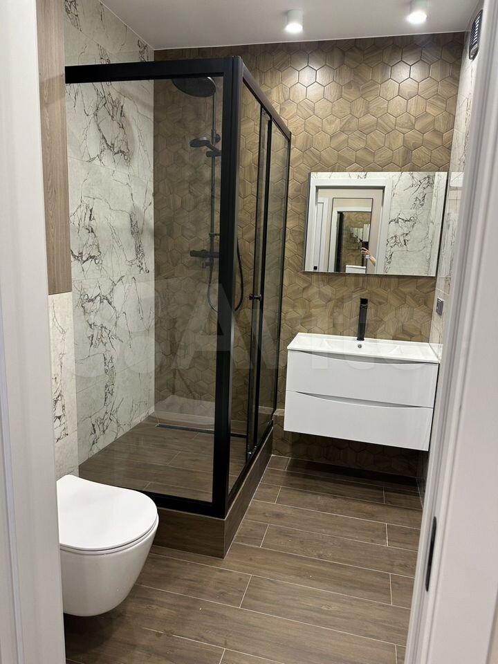Санузел совмещенный, оформлен в современном стиле. Из окон открывается приятный вид на город и лес.