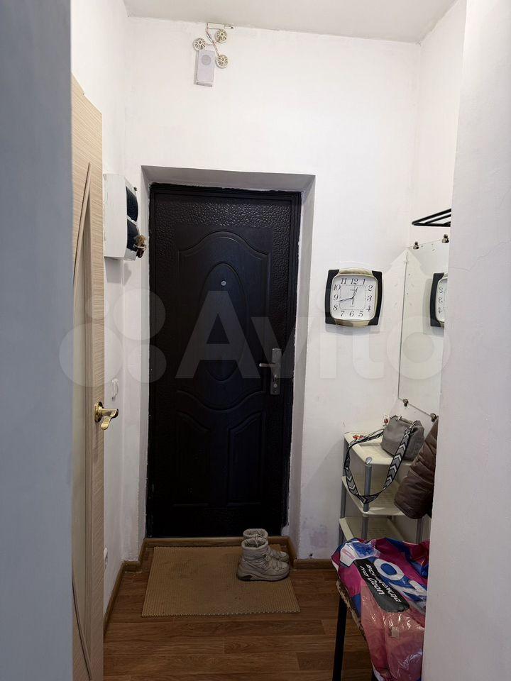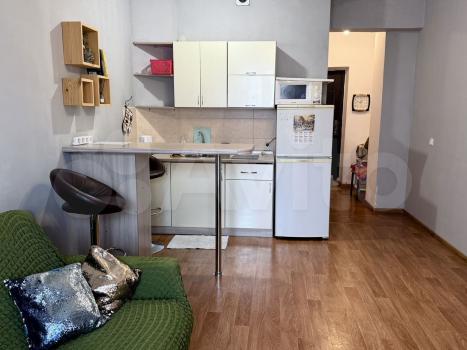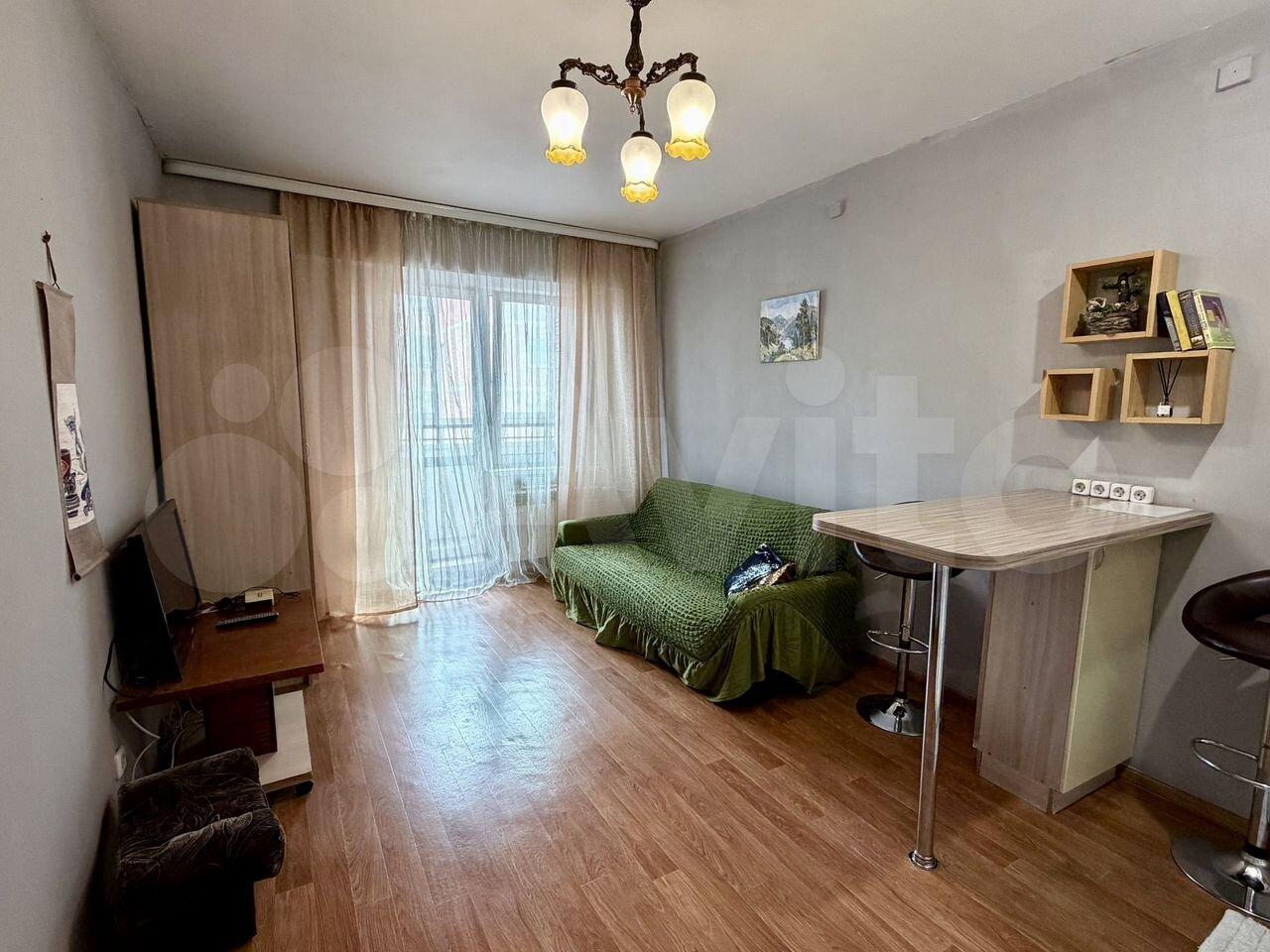 Общая площадь квартиры — 44 кв.м., жилая — 17 кв.м. Просторная кухня площадью 12 кв.м. оснащена необходимой бытовой техникой, включая холодильник и стиральную машину. В комнате установлен шкаф и диван, а также имеется обеденный стол.