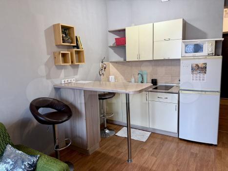 Кухня оборудована необходимой техникой: плита, микроволновая печь и холодильник. Санузел совмещённый, оснащён ванной, раковиной и стиральной машиной.