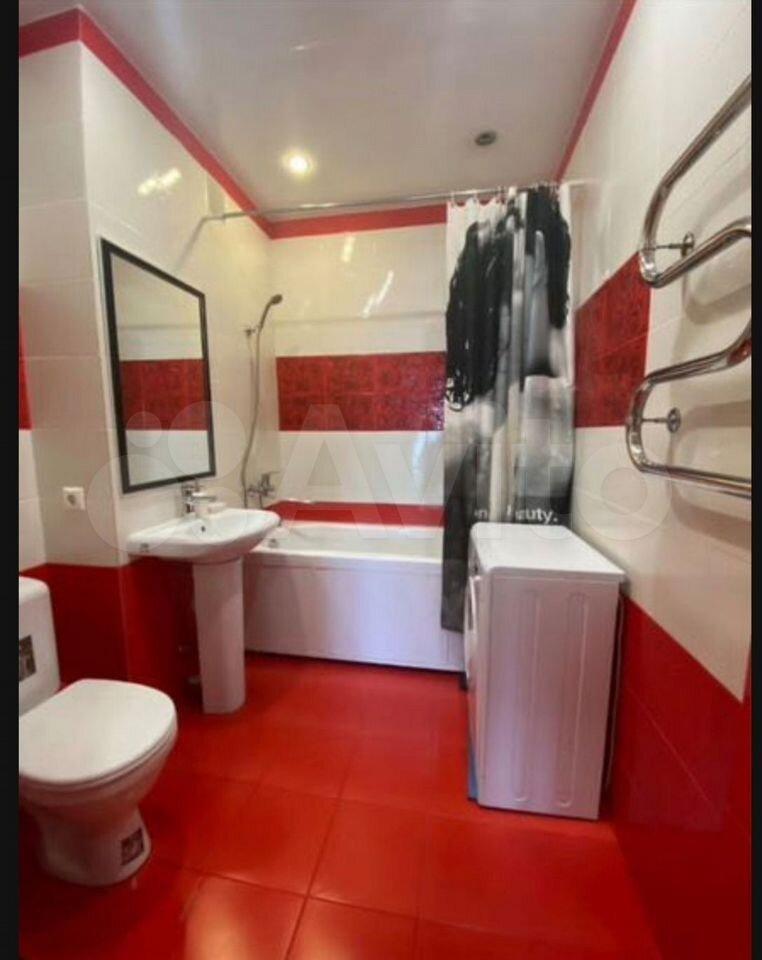 Ванная комната совмещённая, оборудована стиральной машиной и современной сантехникой.