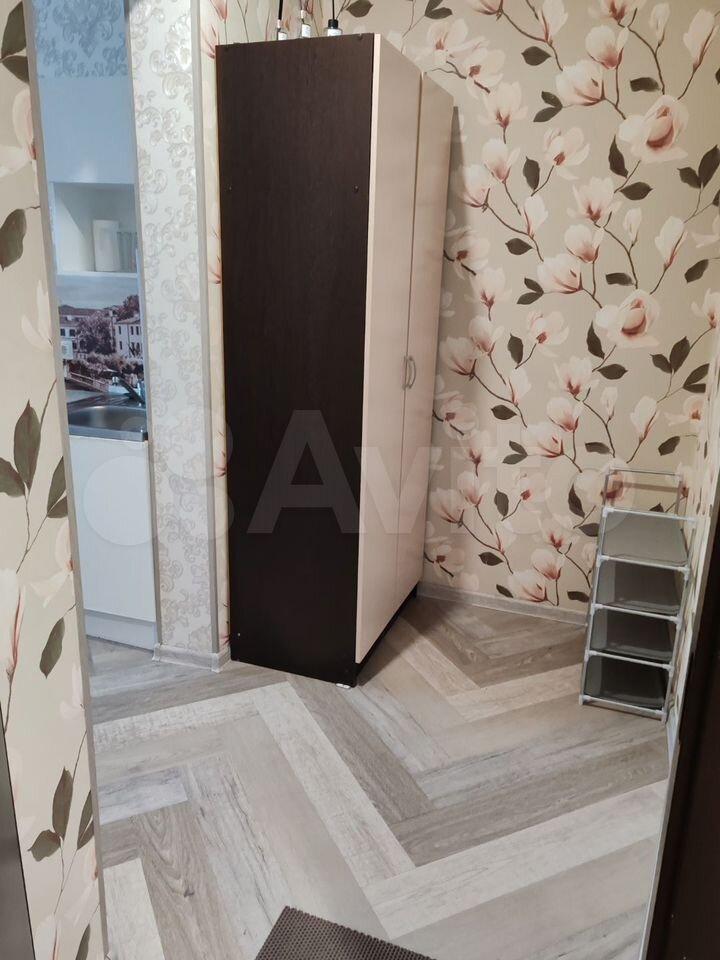 Кухня оборудована необходимой бытовой техникой, включая холодильник и плиту. В комнате установлен вместительный шкаф и диван, обеспечивающие комфортное проживание. Санузел совмещенный, оформлен в светлых тонах, имеется стиральная машина-автомат.