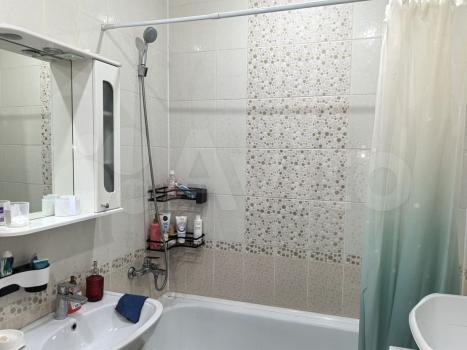 Санузел совмещенный, оформлен современной плиткой. Из окон открывается вид на двор, где есть детская и спортивная площадки, а также открытая парковка.