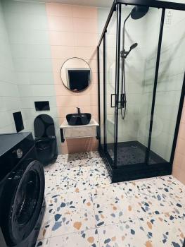 Кухня оснащена необходимой бытовой техникой, включая холодильник, плиту, вытяжку, стиральную машину. Ванная комната совмещенная, с современной сантехникой и стильным декором.