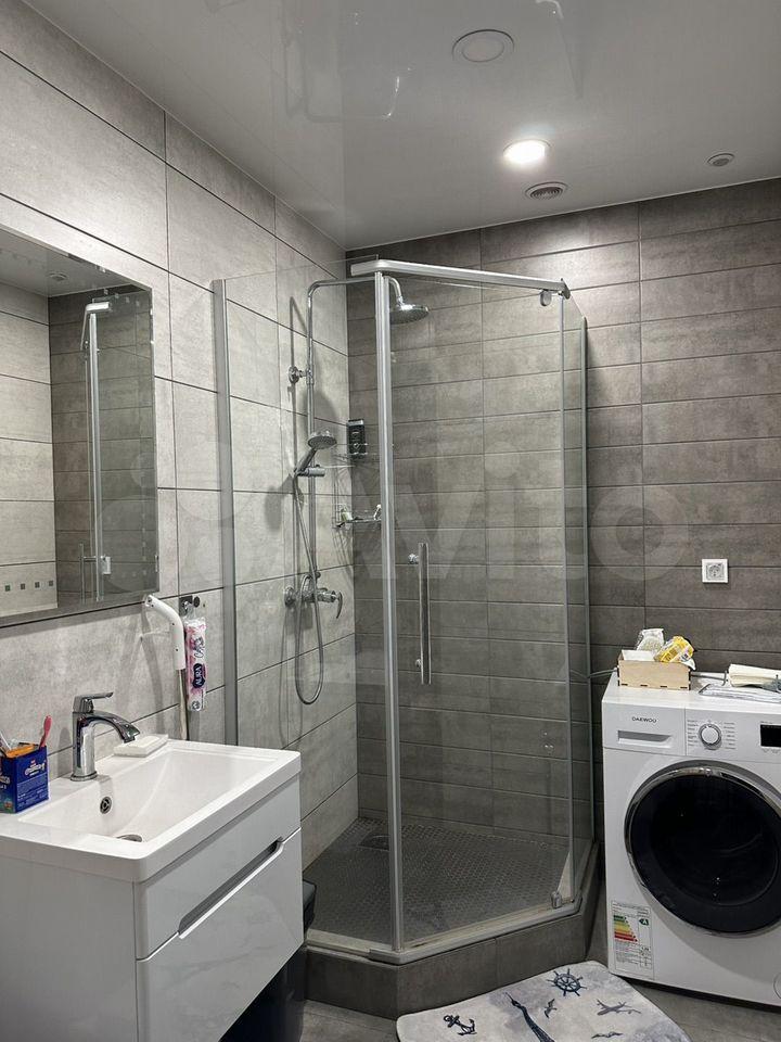 Кухня площадью 6 м² оснащена необходимой бытовой техникой, включая холодильник и стиральную машину. В наличии также микроволновая печь и плита. Ванная комната совмещенная, оборудована современной сантехникой и душевой кабиной.