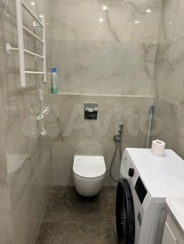 В туалете установлена инсталляция, на полу керамогранит, новая стиральная машина.
