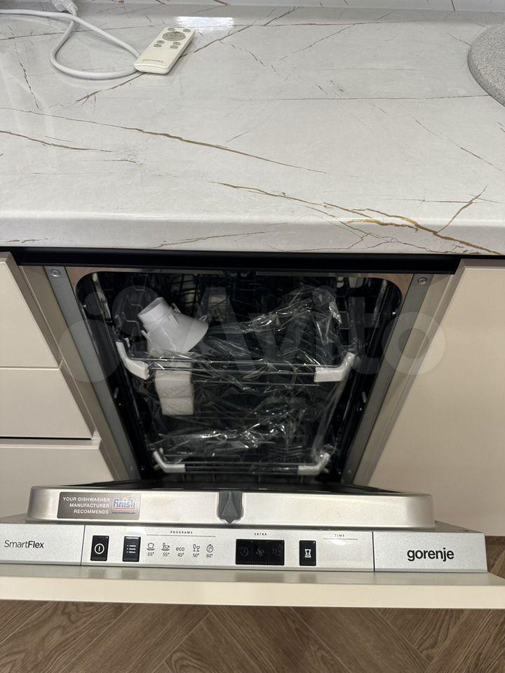 На кухне новый холодильник, встроенная микроволновка самсунг, духовой шкаф, посудомоечная машина бош и варочная панель бош, вытяжка, чайник, посуда, столовые приборы.