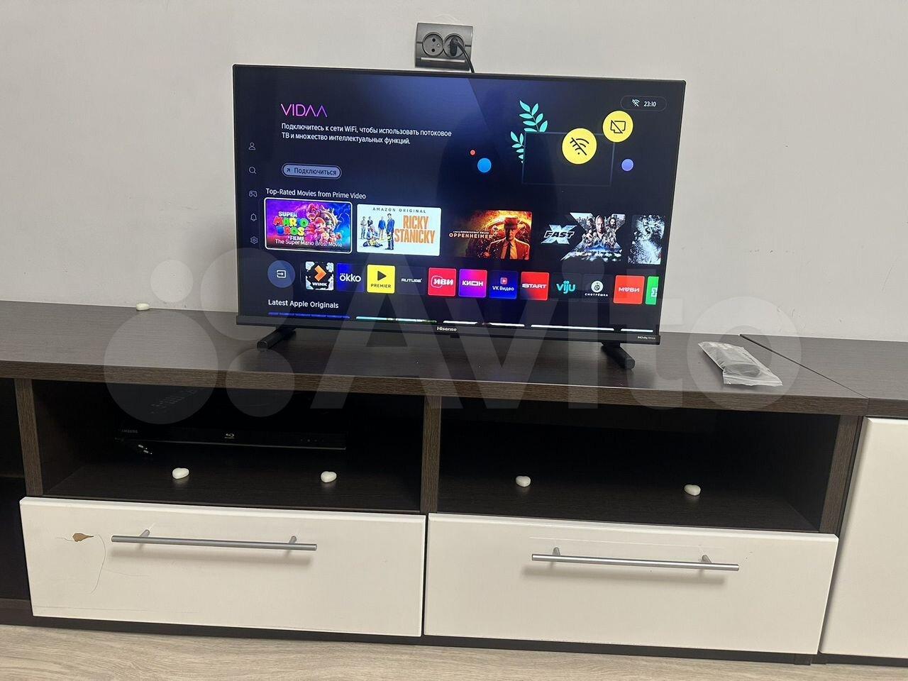 Кухонные шкафы, стол и стулья, новый телевизор, холодильник, чайник и необходимая посуда.