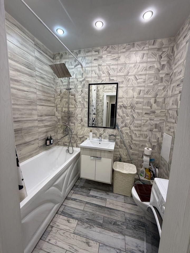 Санузел оборудован ванной, подвесным унитазом,, компактной раковиной и стиральной машиной.