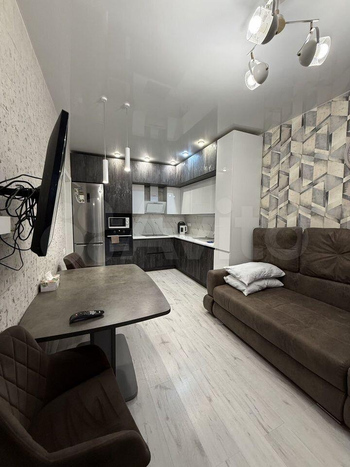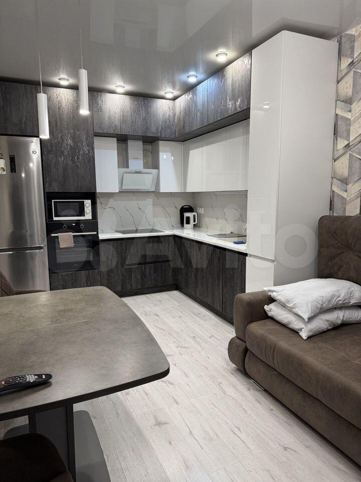 Гостиная-кухня обустроена стильным кухонным гарнитуром с подсветкой, современной бытовой техникой , плитой, духовкой, холодильником), обеденным столом и комфортным уголком для отдыха с мягкой мебелью и ТВ.