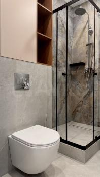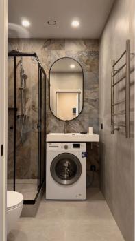 В спальне вместительный шкаф и удобный диван. Ванная комната выполнена в современном стиле, установлена душевая кабина и стиральная машина.