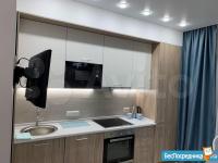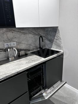 Совмещенная кухня-гостинная со всей необходимой техникой (плита, чайник, вытяжка, микроволновая печь, холодильник, посудомоечная машина).