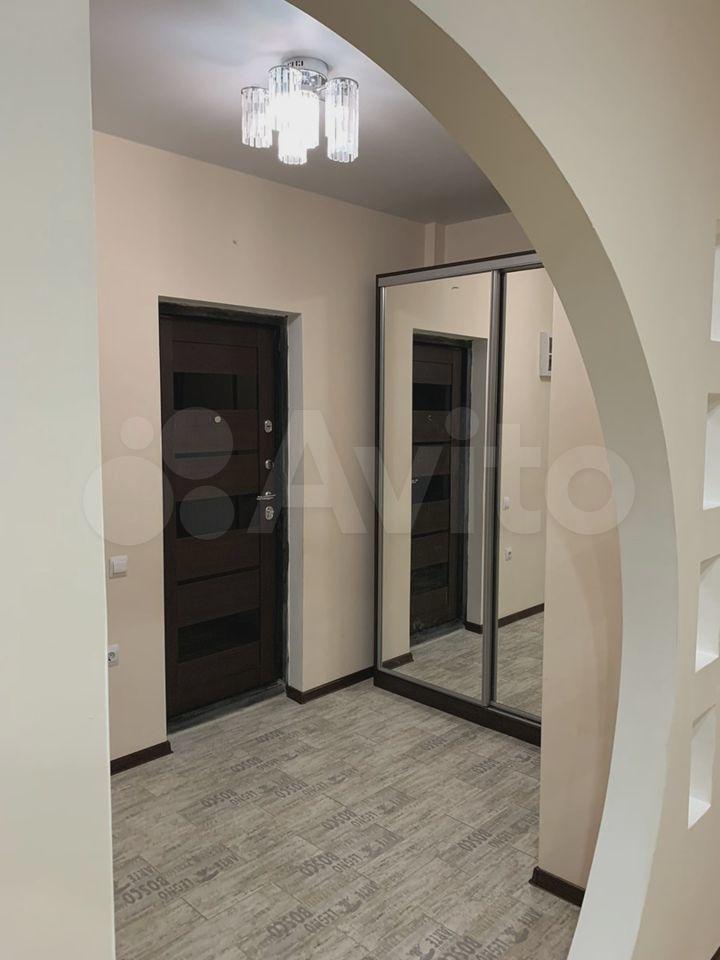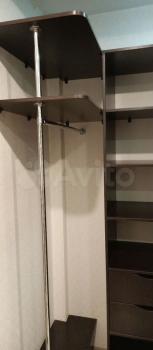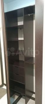 В коридоре большой вместительный зеркальный шкаф-купе, кровать, телевизор, на кухне -гарнитур, холодильник.