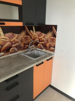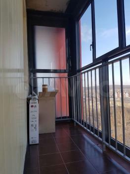 Натяжные потолки с точечными светильниками. На полу в комнате ПВХ-плитка, в кухне на полу керамоплитка. Большой балкон полностью стеклянный.
