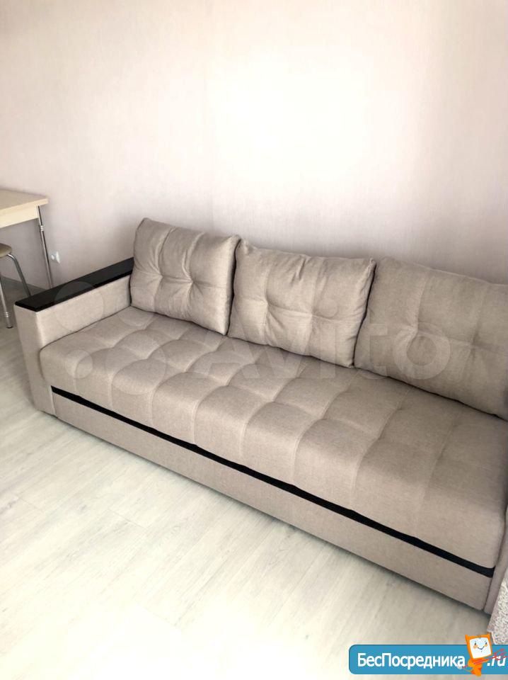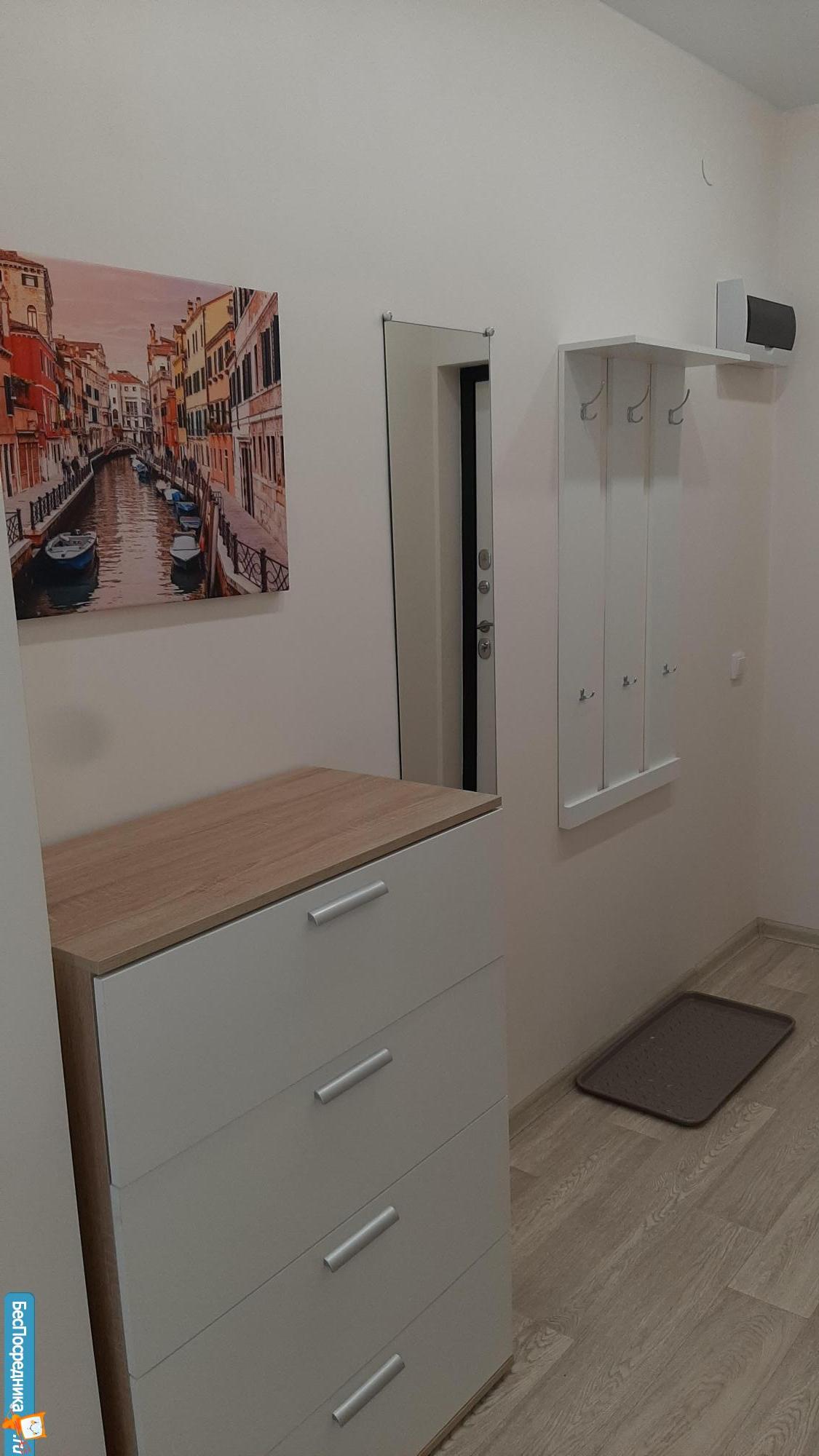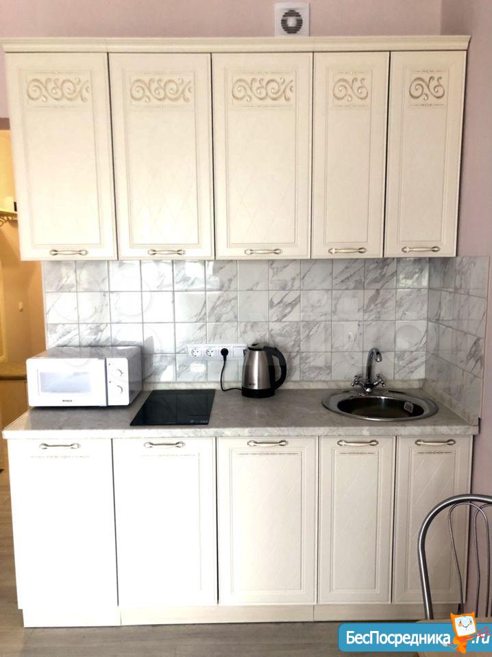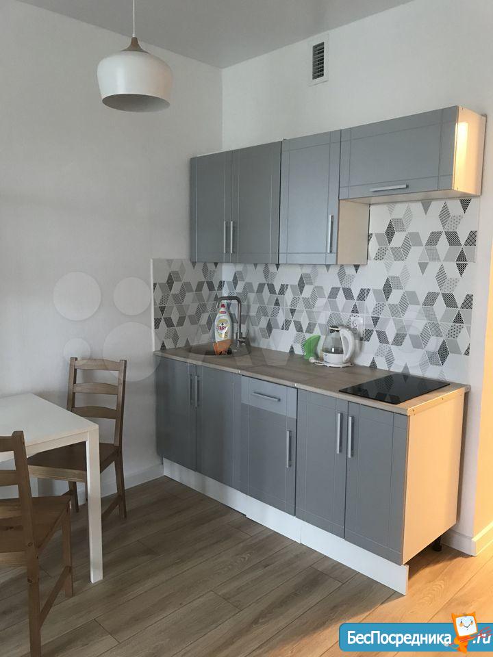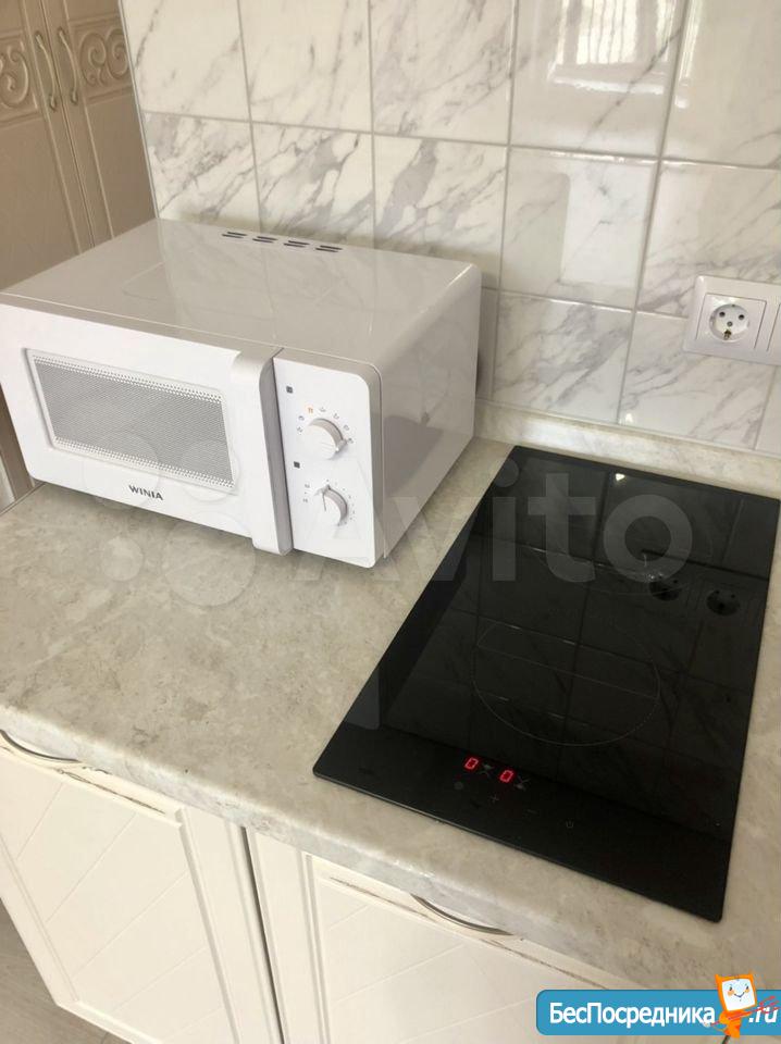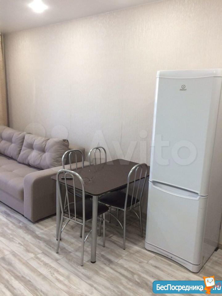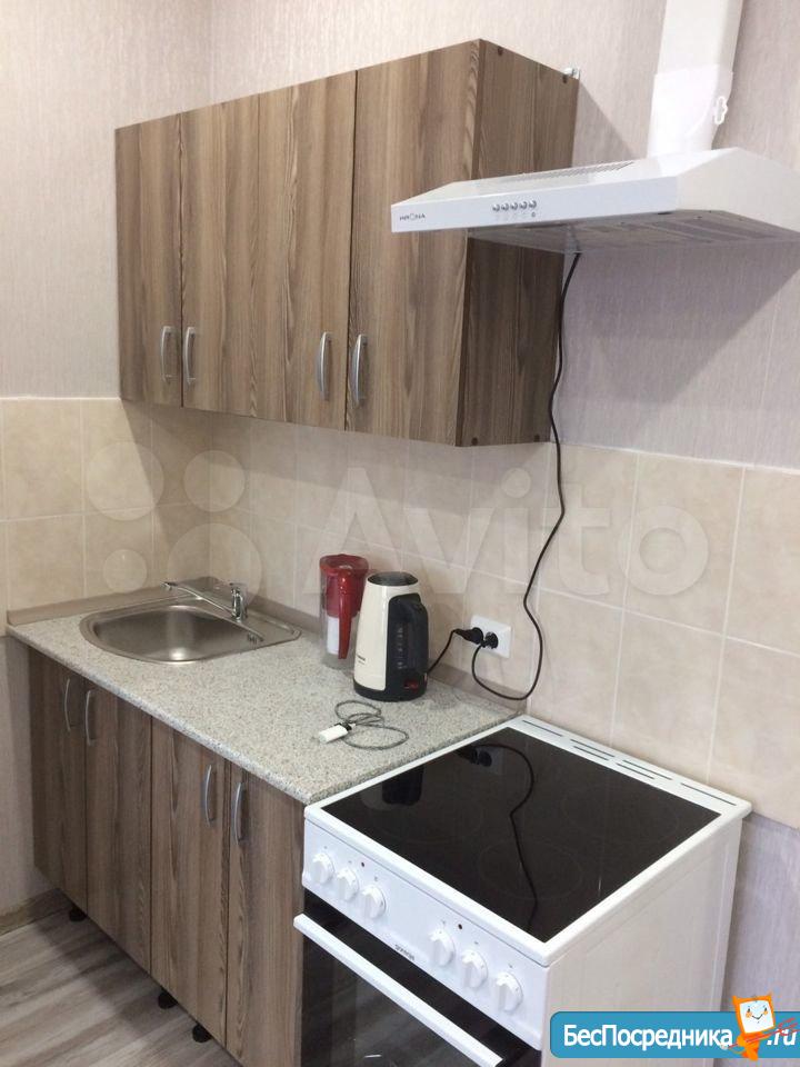 В квартире есть все необходимое для проживания: удобный новый диван, холодильник, плита, стол с 4 стульями, чайник, вытяжка, кухонный гарнитур, стиральная машина, шкаф.