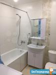 Кухня оборудована современной техникой: холодильник, плита и стиральная машина. Санузел совмещенный, оформлен в светлых тонах.