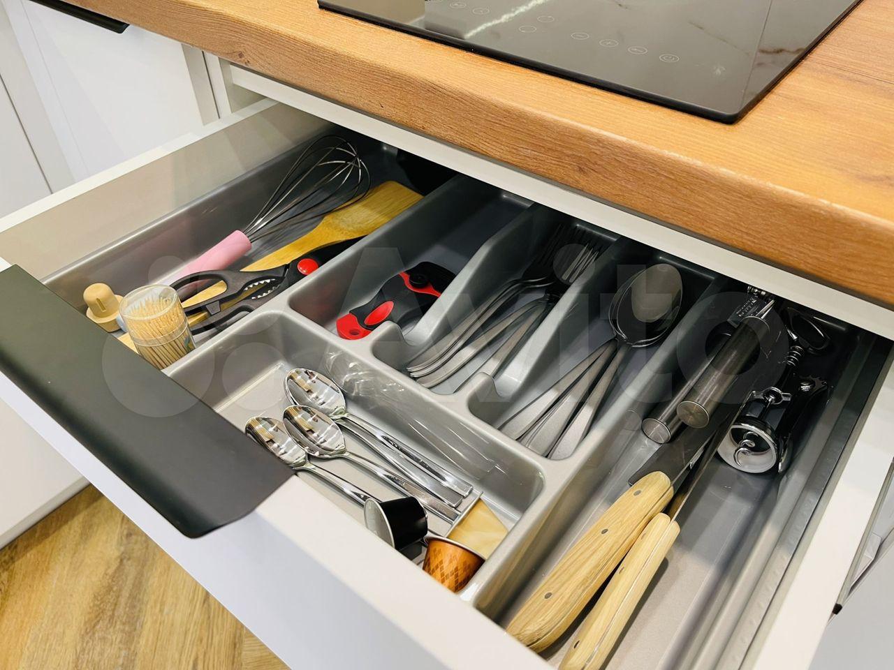 — Продуманная кухня с встроенной техникой и посудомоечной машиной, совмещенная с залом и обеденной зоной.