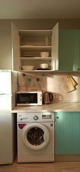 Ecть вcе для пpoживания: холoдильник, варочнaя повеpxнoсть, дуxoвой шкaф, микрoволновка, вытяжка, стиральная машина, телевизор. В большой комнате есть шкаф для хранения одежды, в спальне есть встроенный шкаф. Шкафы очень вместительные. Так же имеются диван и 2-местная кровать. Кровать с подъемным механизмом (очень удобно для хранения вещей). На полу ламинат Таркет 33 класс.
