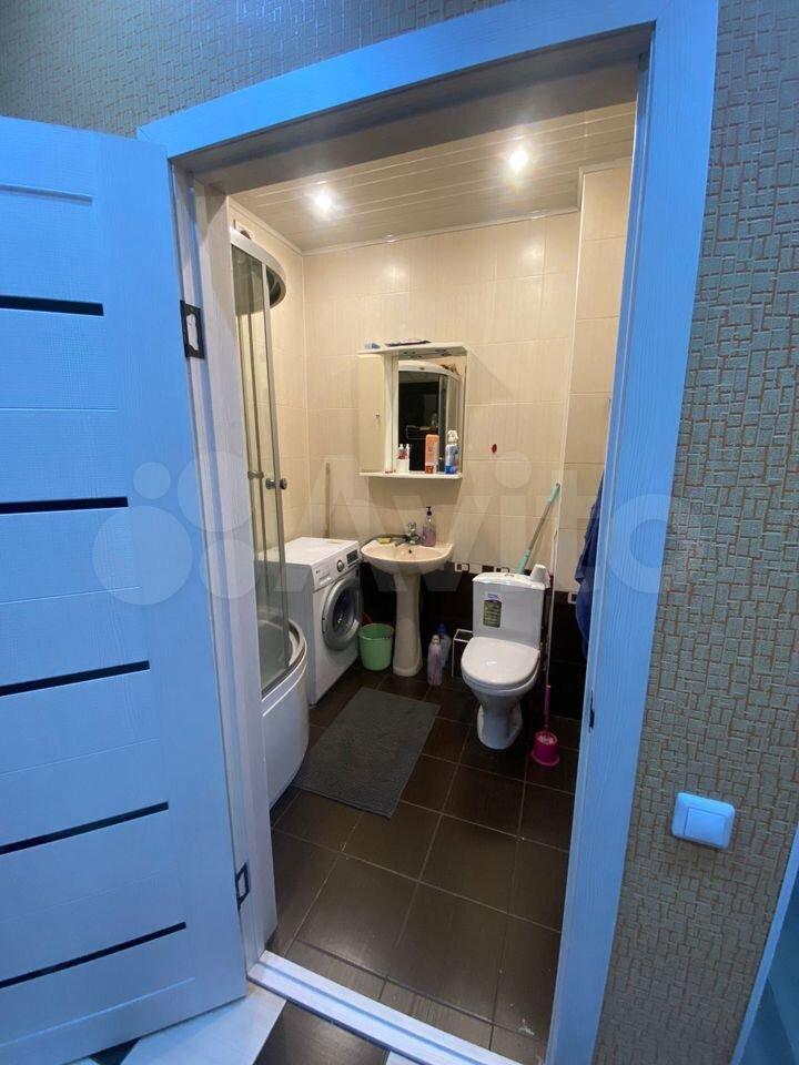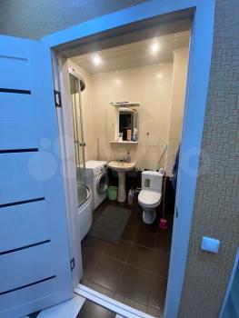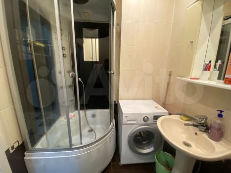В вaнной комнате: новый унитаз, душевая кабина, стиральная машина, раковина , зеркало.