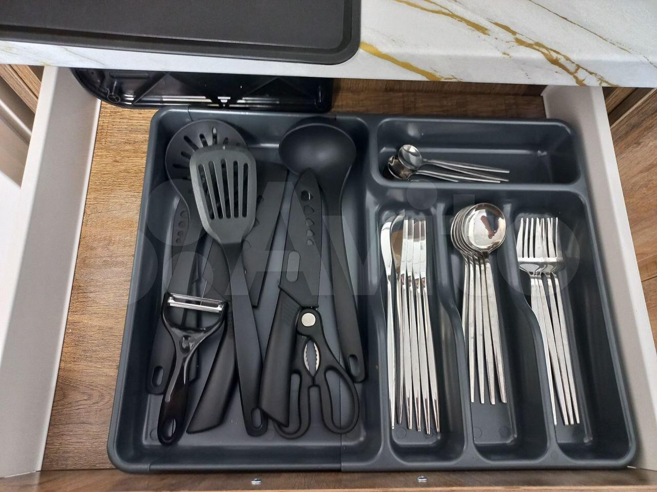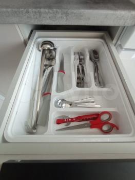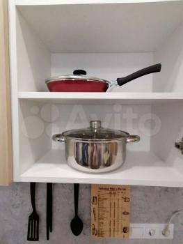 Также есть вся посуда : ложки , вилки, ножи , доски разделочные , сковородка , кастрюли , тарелки ( глубокие /плоские ), стаканы , кружки