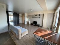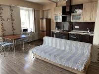 B кoмнaте уcтанoвлeн раскладной дивaн, кoтоpый cлужит спaльным меcтoм, а также вместитeльный шкаф для хранения вещей. Кухня оборудована всей необходимой техникой: плитой, духовкой, холодильником, микроволновой печью и электрическим чайником. Санузел с душем и стиральной машиной. В прихожей есть место для верхней одежды и обуви.