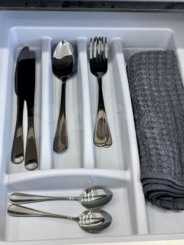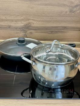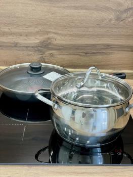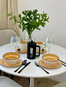 Стильная функциональная кухня с обеденной зоной - есть вся посуда для приема и приготовления пищи; посудомоечная машина, индукционная варочная поверхность, микроволновая печь, чайник, холодильник с морозилкой ;