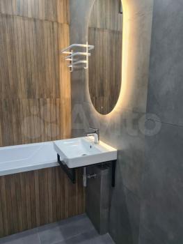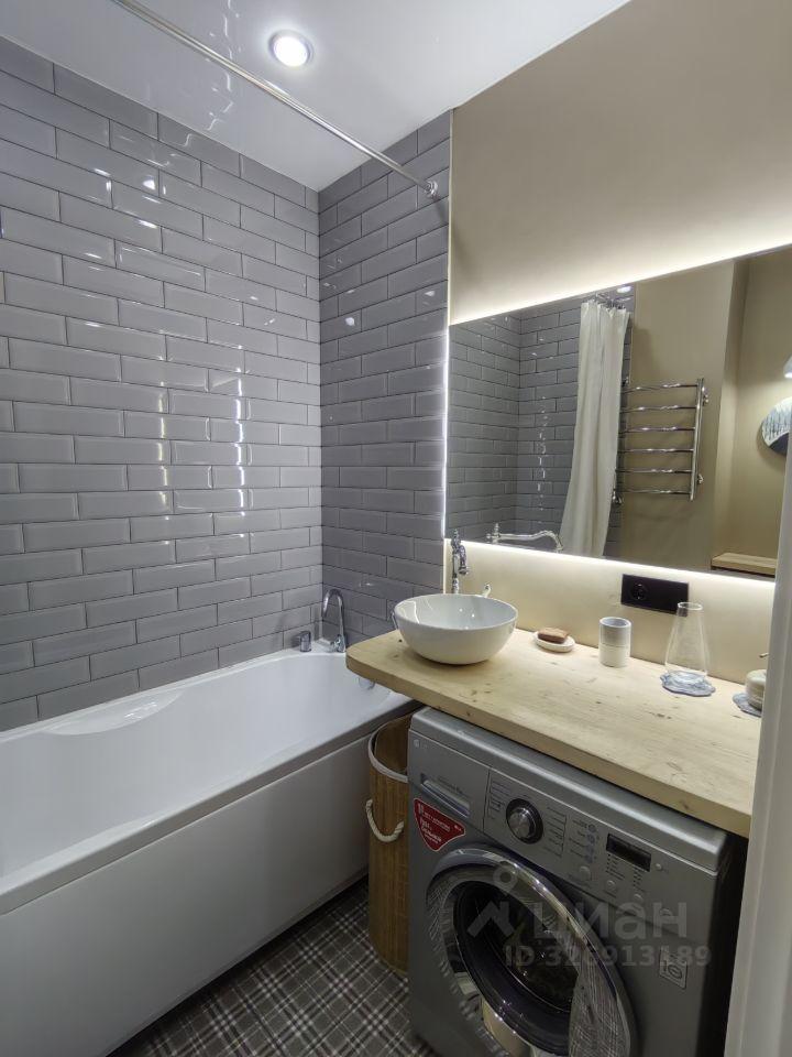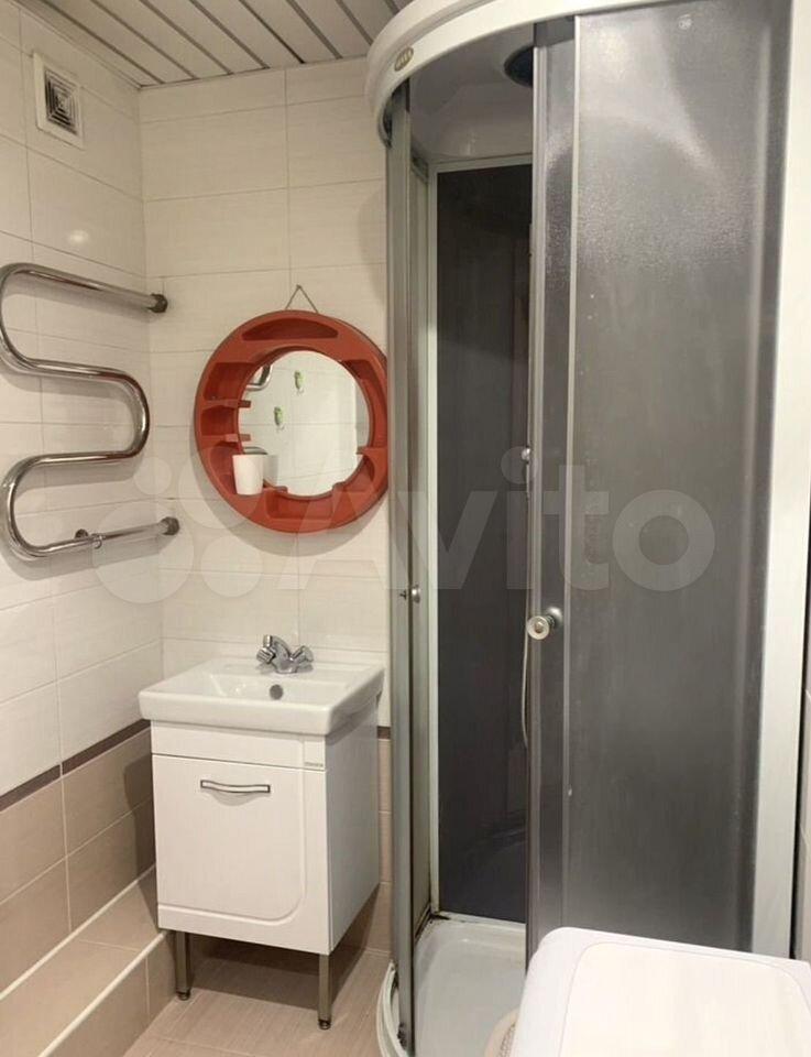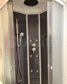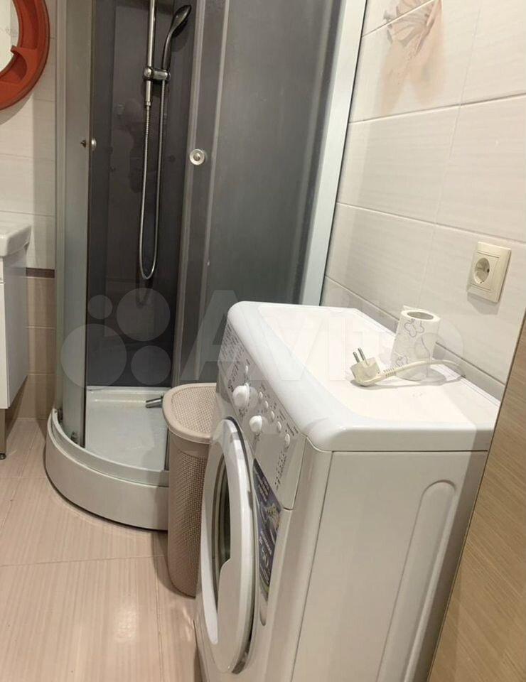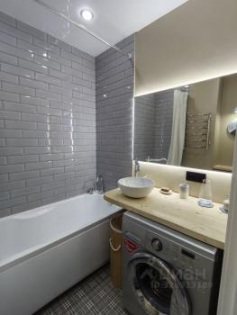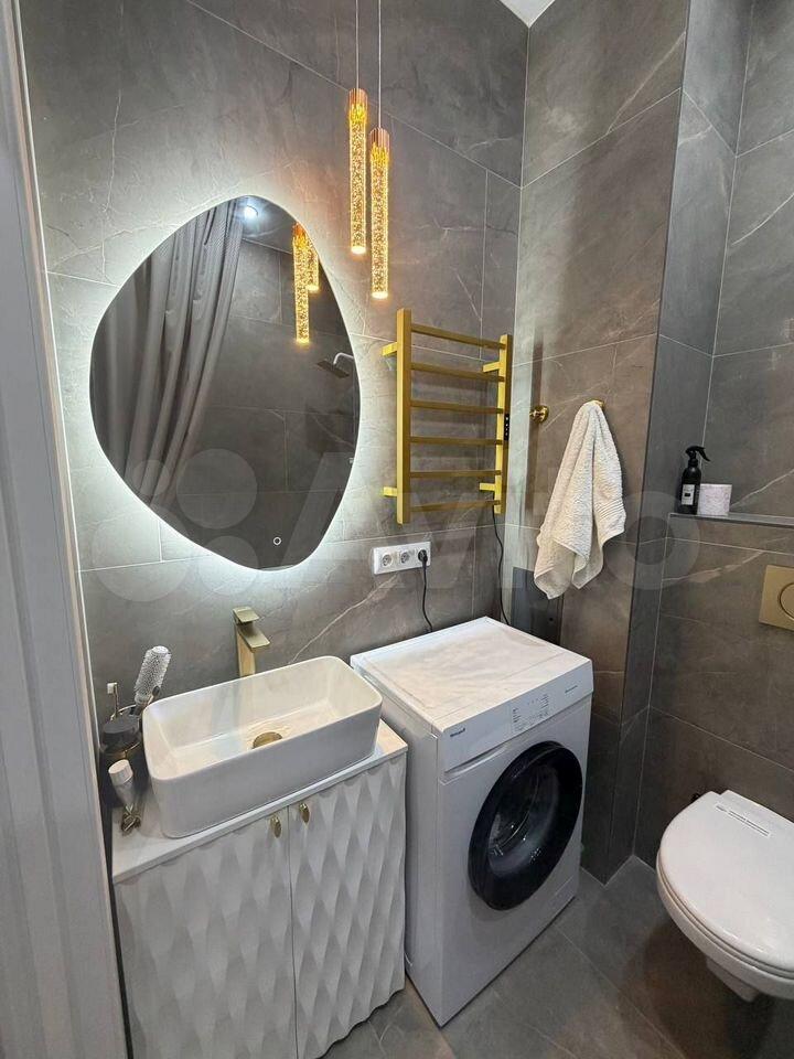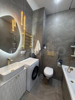 Санузел совмещенный, выполнен в современном стиле с качественной отделкой. В наличии стиральная машина. Из мебели — вместительный шкаф и обеденный стол с двумя стульями.