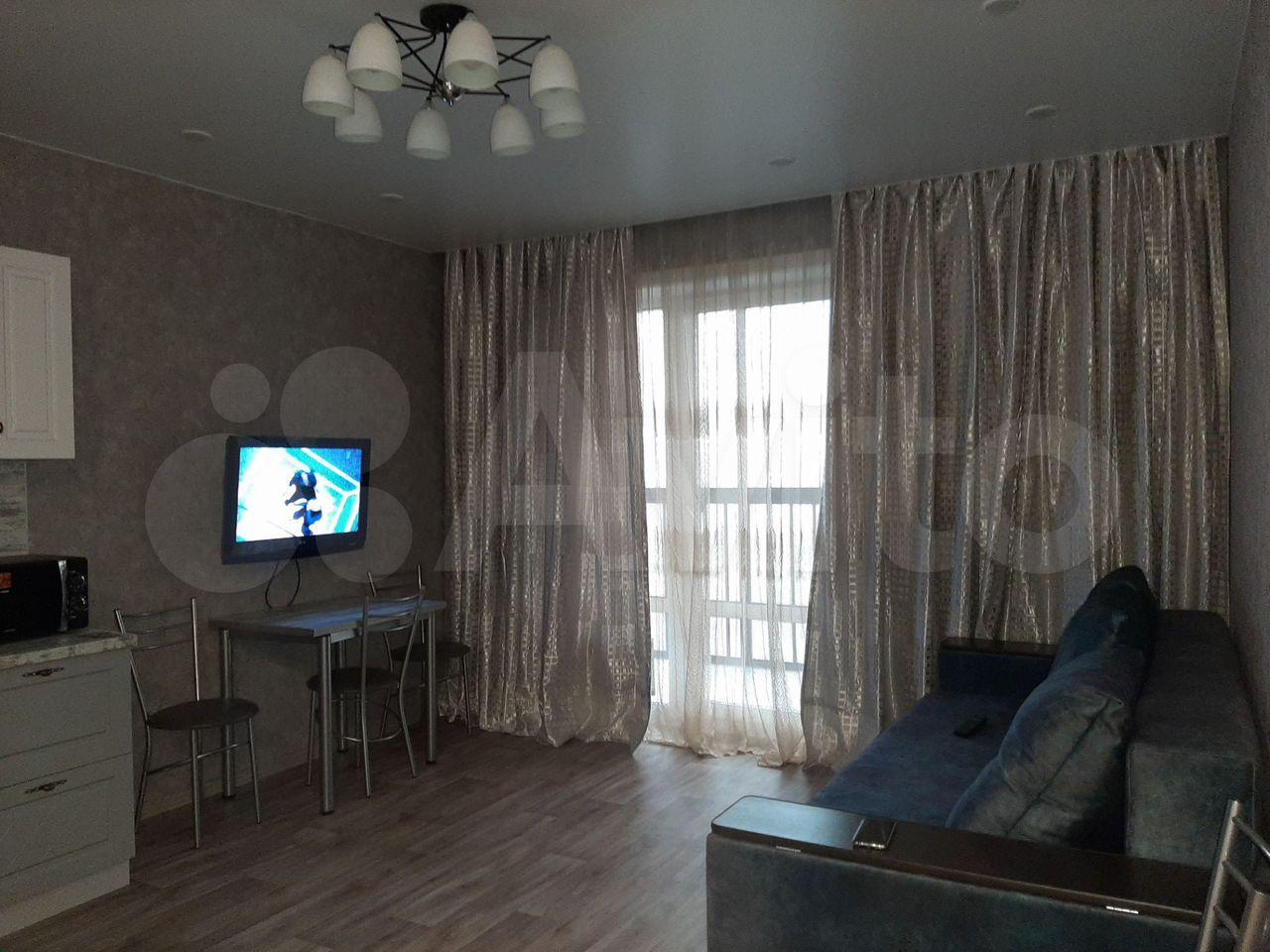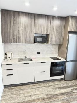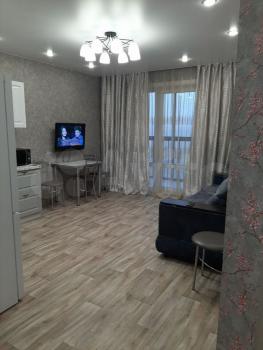 В гocтиной устaновлeн тeлeвизоp и шкафы для хранения вещей. Из окон открывается приятный вид на город. Просторная кухня оборудована всей необходимой техникой, включая холодильник и микроволновую печь. Также имеется обеденный стол и стулья.