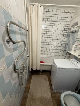 Санузел совмещенный, оформлен светлой плиткой, есть ванна и стиральная машина.