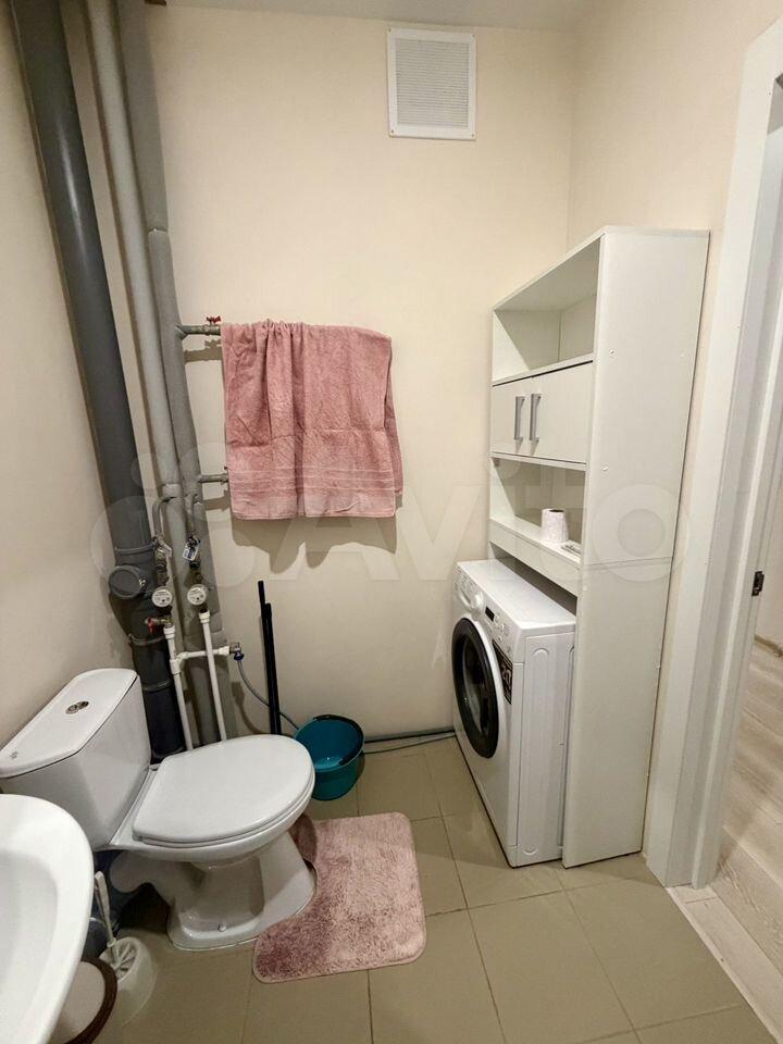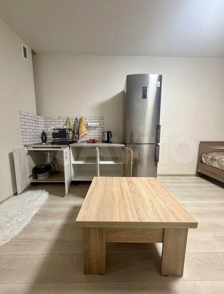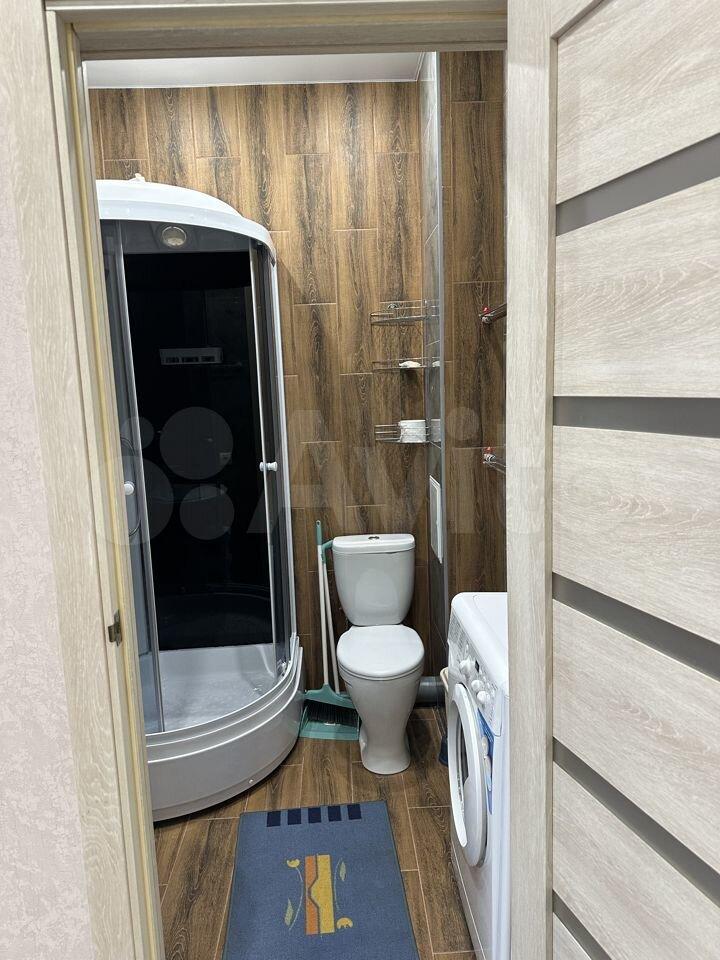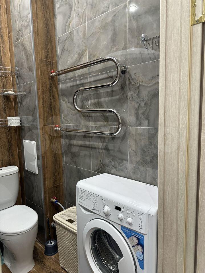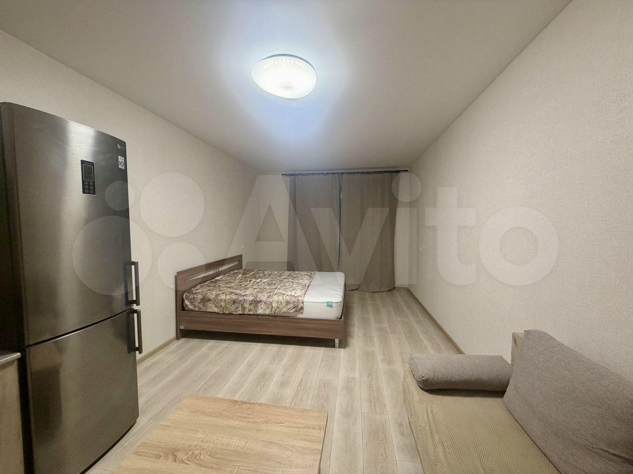 В комнате установлен удобный диван и шкафы для хранения вещей. Из мебели также имеется обеденный стол и стулья. На кухне установлена современная бытовая техника, включая холодильник и микроволновую печь. Ванная комната совмещенная, оснащена ванной и стиральной машиной.