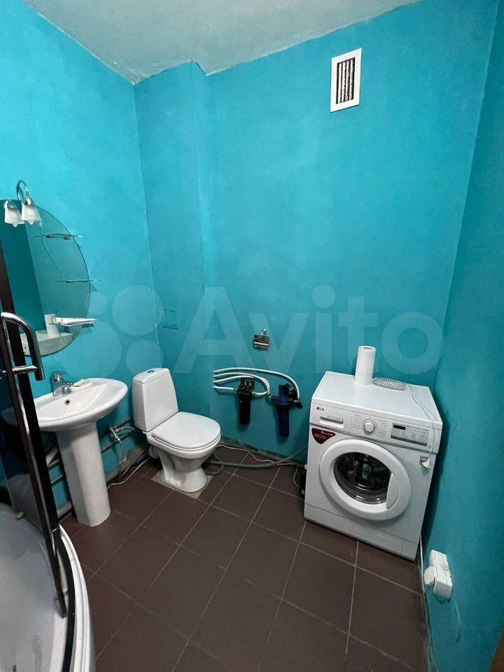 Кухня оборудована необходимой техникой: холодильник, плита, микроволновая печь и стиральная машина. Ванная комната и туалет раздельные, оформлены в синих тонах.