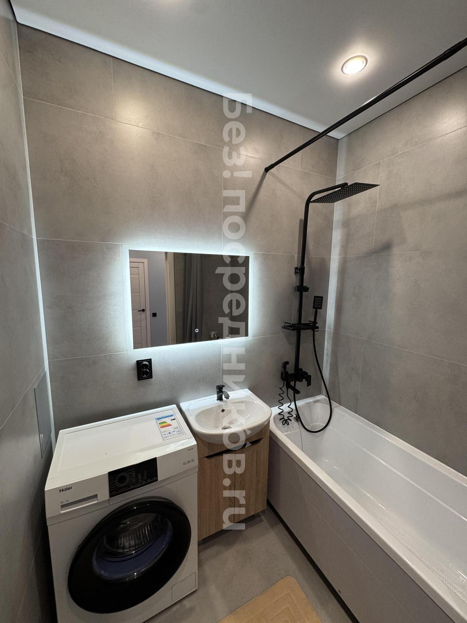 Шикарный санузел с инсталляцией, тропический душ, ванна, зеркало с подсветкой.