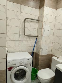 Ваннaя комнaтa отделaна кaфельной плиткой, имеется стиральная машинка-автомат.